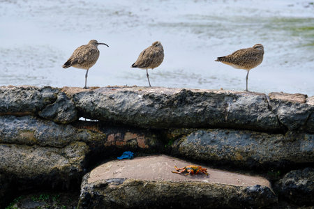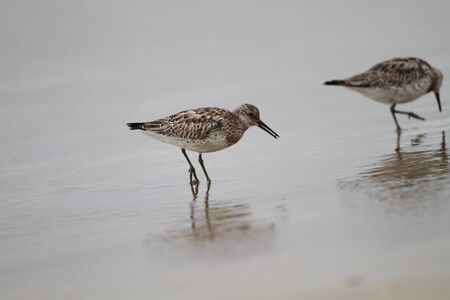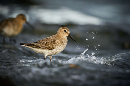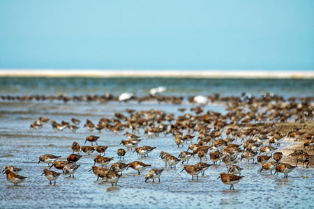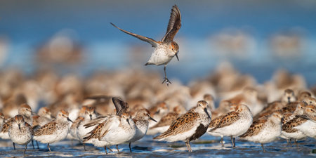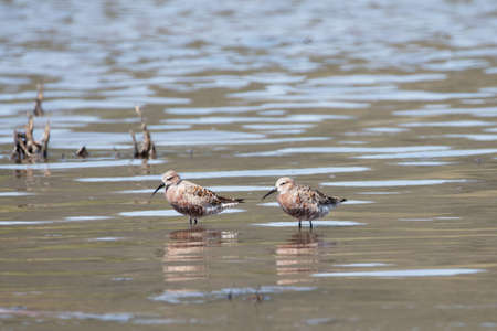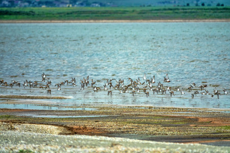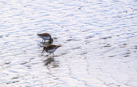 Dunlins by the water. Wading birds at the seashore. Travel photo, street view, selective focus, blurred background, horizontal.