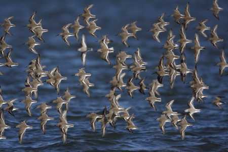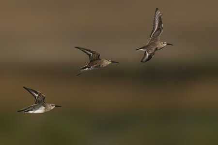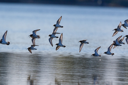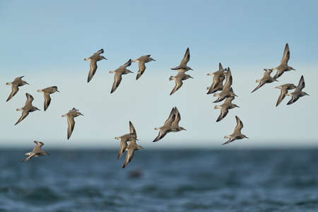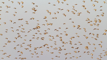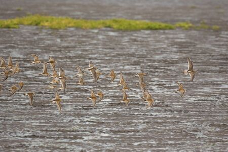 Flock of sandpipers flying in the blue sky. Wildlife scene from nature.