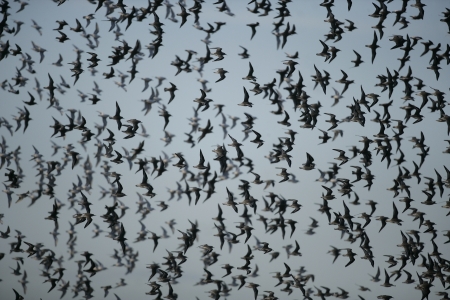 sandpipers in flight on a background of gray sky, a flock dunlins,spring