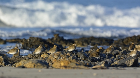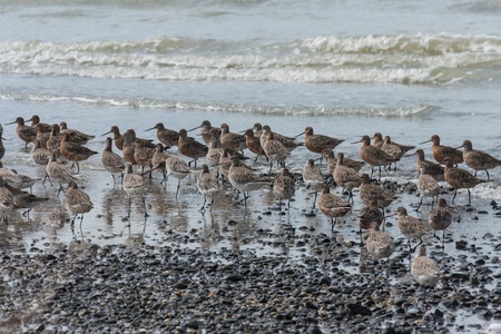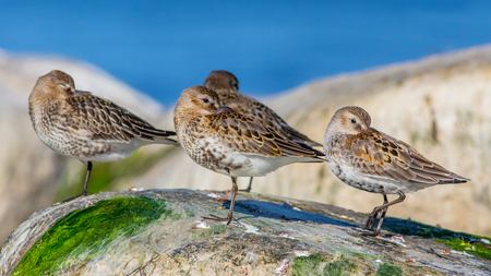 Dunlin Calidris alpina on the shore in spring British Columbia Canada. Wading birds at the seashore. Flock of the many small birds sleeping on the shore of the sea.