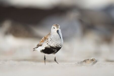 portrait of Dunlin (Calidris alpina) small wader bird foraging on a beach during migration. IJmuiden Netherlands. Wildlife scene of nature in Europe.