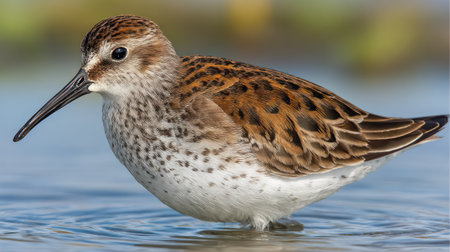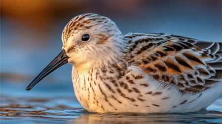 Highly detailed, photograph captures a small migratory wading bird resting or feeding in calm, shallow water. The bird exhibits intricate brown and white mottled plumage, catching warm, golden light on its head and chest, contrasting with the cool blue tones of the water and background. Its long, slender black beak is prominent in the foreground.