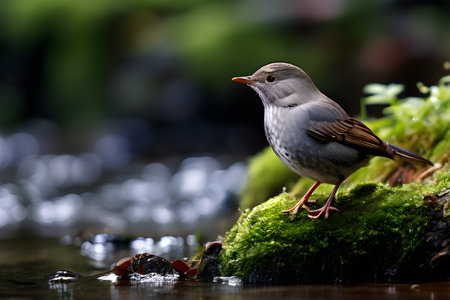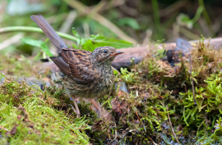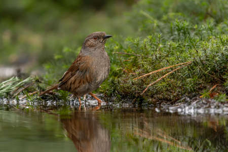 Dunnock posing in wet and mossy environment neat a water pond in forest