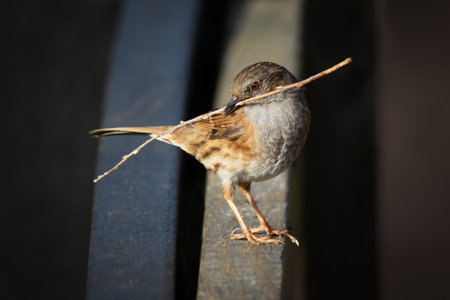 a close up portrait of a dunnock perched on a fence. It has a twig, nest material, in its beak. There is copy space around the bird