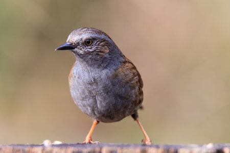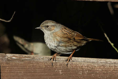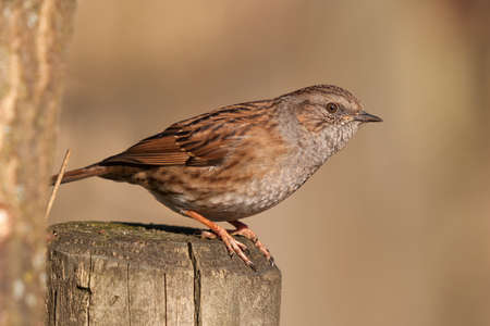 Dunnock (Prunella modularis) also known as a hedge sparrow, perched side on a wooden post