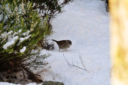 Dunnock (Prunella modularis) standing in snow looking for food in early spring.