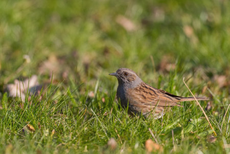 Dunnock (Prunella modularis) foraging for insects on a garden lawn.