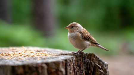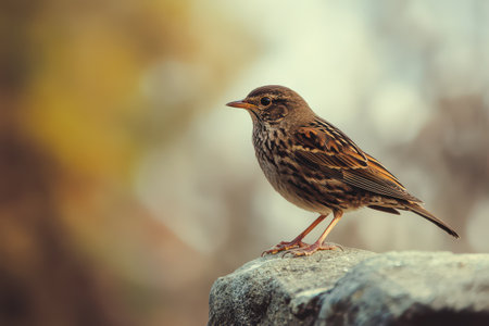 A small sparrow stands on a rock showcasing its intricate feathers while surrounded by a blurred autumn background.