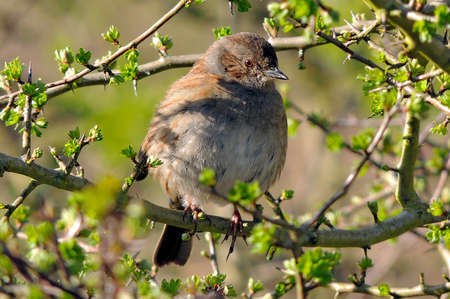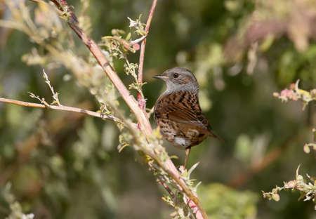 The dunnock (Prunella modularis) sitting on branch of bush in soft evening light. Closeup view.