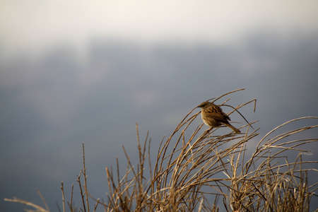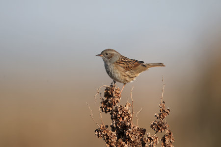 Hedge Accentor (Dunnock) perching on a dead stem near East Grinstead