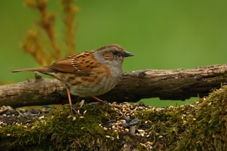 A Dunnock, (Prunella modularis) on the old brown branch. Small european songbird. Morning sun. Green background.