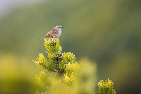 Dunnock, prunella modularis, sitting on top of scrub branch with green needles in summer nature. Passerine bird with brown and gray feathers perched on dwarf pine in mountains.