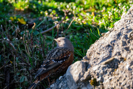 Alpine accentor (Prunella collaris) sitting on a rock. Detailed portrait of a beautiful mountain bird in its habitat with soft background. Wildlife scene from nature. Austria