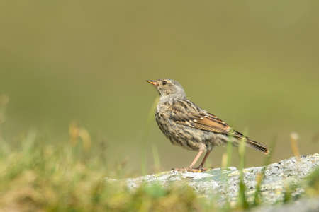 A beautiful Dunnock (Prunella modularis) standing on the rock in the forest