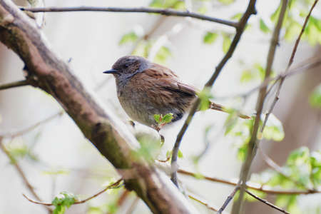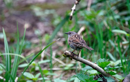 Dunnock on a branch in the forest. Birds in nature.