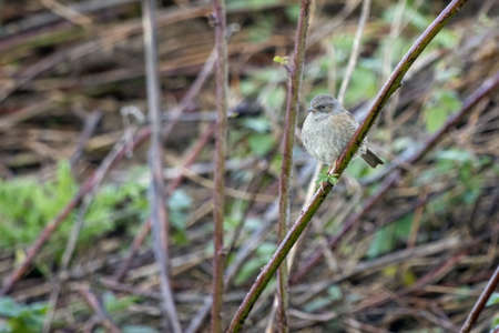 The dunnock (Prunella modularis) filmed in its natural habitat during autumn migration. Close-up and detailed photo of bird plumage