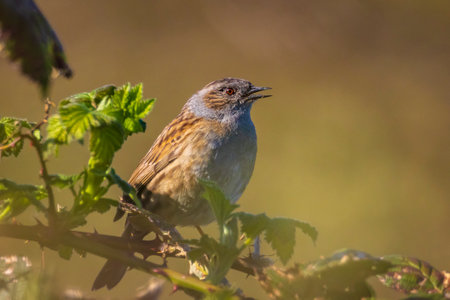 Close-up of a Dunnock, Prunella modularis, bird in a tree display and singing a early morning song during Springtime to attract a female.