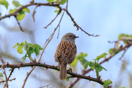 Hedge Accentor (Dunnock) perched on a bramble in Sussex