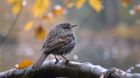 Small bird perched on a branch with water droplets in a serene environment