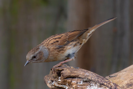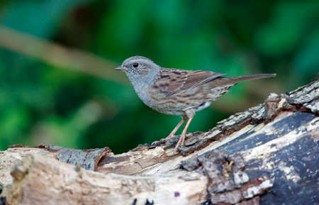 Hedge Accentor on sawed off tree trunk in forest clearing