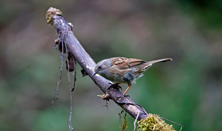 Dunnock (Prunella modularis) perched on branch looking at side on green ecological garden background