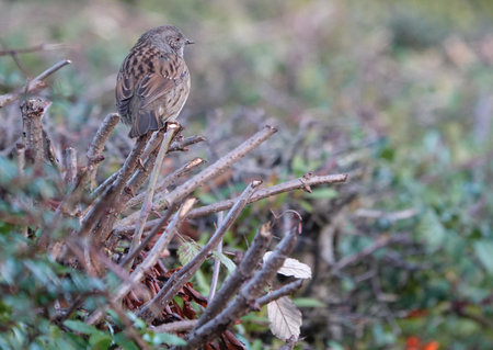 Close-up of a dunnock (Prunella modularis) in winter plumage, photographed in its natural habitat of dense bush and against a beautifully blurred background.