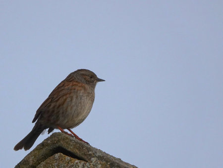 Portrait of adult dunnock or hedge accentor, Prunella modularis, perching on brick wall in garden