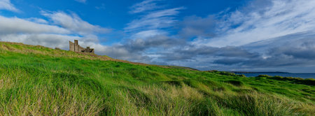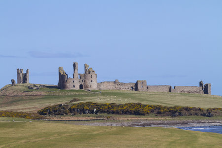 Iconic Dunstanburgh castle ruin from south built in the 14th century viewed from the southern shoreline