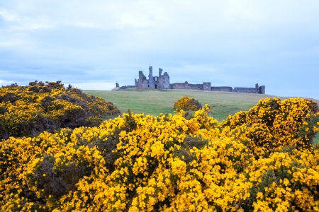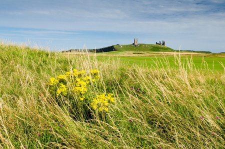Dunstanburgh castle with Yellow flower on the north east of the UK near Craster in Northumberland