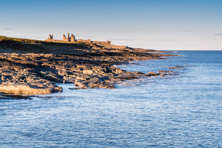 Dunstanburgh Castle in Northumberland England. The Castle, now a ruin, occupies a commanding position at Embleton Bay, Northumberland, England, as the dawn light reflects on the black rocks