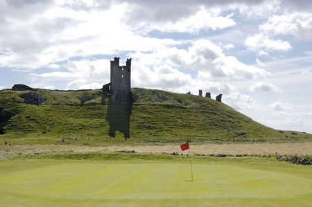 One of the greens of Embleton Golf course and Dunstanburgh Castle