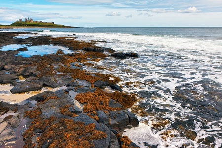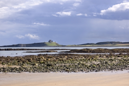 Dunstanburgh Castle viewed from the rocky shore in Northumberland,England, between the villages of Craster and Embleton