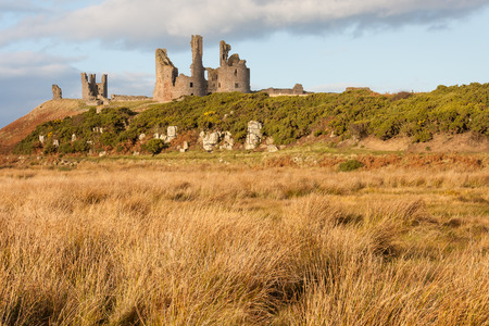 Dunstanburgh castle with tussock wetland in Northumberland, United Kingdom