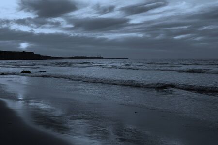 Druridge Bay from the Dunes, located on the North Sea in Northumberland's AONB in England, it is a 7 miles long bay between Amble and Cresswell