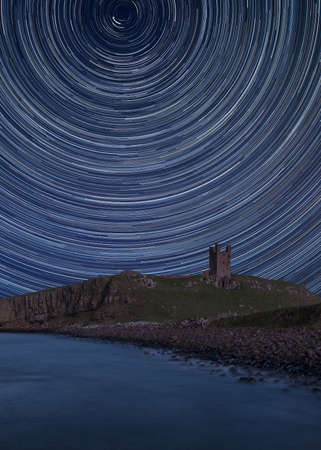Digital composite image of star trails around Polaris with Beautiful landscape image of Medieval Castle on coastline