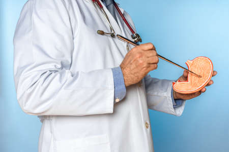 unrecognizable doctor in gown pointing to the inside of a stomach of an anatomical model