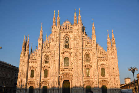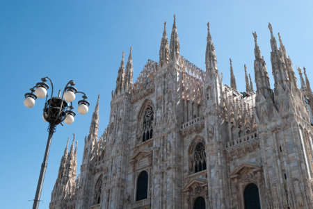 Milan, Italy - 06 17 2016: Duomo catholic cathedral facade and vintage streetlight with sunny blue sky copy space. Morning sunrise light of summer in italian landmark in downtown Lombardy capital