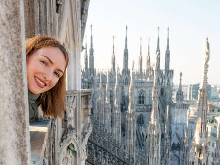Young happy woman looking out of Duomo Milan Cathedral window from the roof while looking at camera. Happy tourist on the rooftop of Duomo di Milano