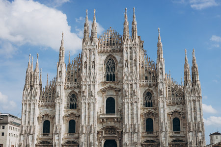 Milan Cathedral in summer, Italy. Nice view of ornate facade of the famous great Milan Cathedral. Historical gothic architecture of Milan. Top tourist attraction on piazza in the city