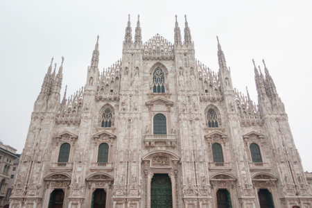 Milan, Italy - March 19, 2025 : Duomo di Milano gothic marble facade with spires and statues on Piazza del Duomo