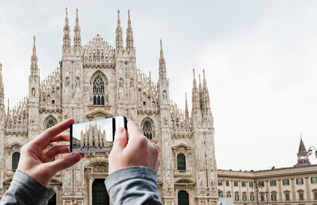 Tourist taking a picture of Milan Cathedral, Duomo at Piazza del Duomo. Italy