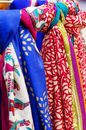Range of colorful silk scarfs in the shop.