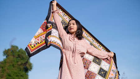 Young asian girl standinf at field grass and blue sky.