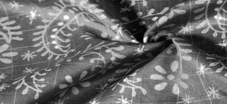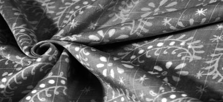 Background texture, Black and white silk fabric, silver. titanium. floral pattern, corrugation, reef, undulation, undulation, ripples, a small wave or a series of waves on the surface of the fabric,
