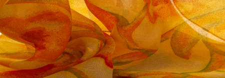 Texture, Pattern. Smooth elegant yellow fabric texture with abstract red print. luxury as abstract background. Luxury Christmas background. Fabric, delicate.