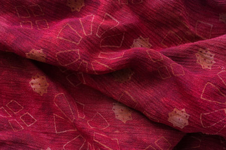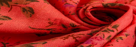 red silk fabric, delicate weaving, check print scarf, design, openwork weaving. Texture, pattern