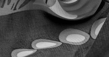black and white, silk fabric with white drawings of flowers circles. Charmeus has a beautiful drapery. It can be assembled in soft fullness Background design texture,