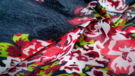 top view closeup textured dark folded soft cotton scarf with bright red, blue and green floral print