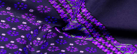 silk fabric of dark blue color with blue and purple flowers, dense fabric, double-sided based on triacetate fibers.