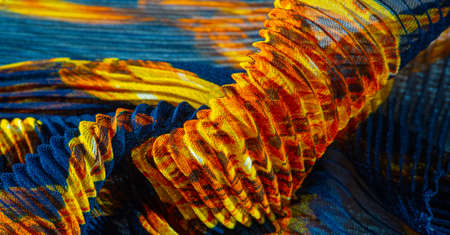 silk crimped. Blue, yellow, brown, burgundy colors. Ruffled silk fabric in vintage style. Floral pattern for elasticity. Opens the gathered fabric into pleasing and flattering folds.